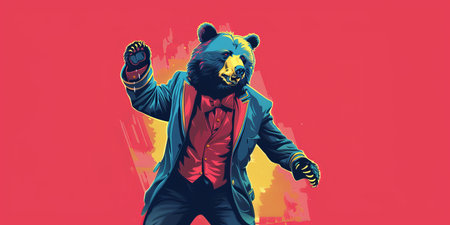Bear in vibrant 80s outfit with sunglasses, dancing, orange and pink gradient background