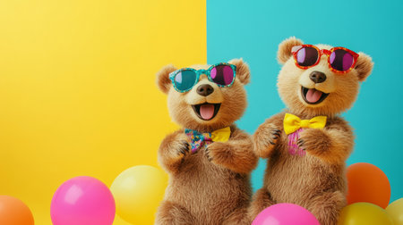 Two happy brown bears wearing sunglasses and bow ties celebrating with balloons on colorful background
