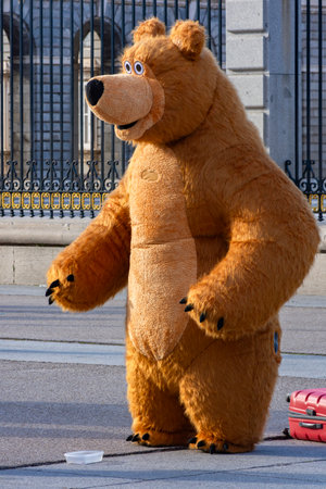 Big teddy bear entertaining people on Armeria square near Royal palace, Madrid, Spain