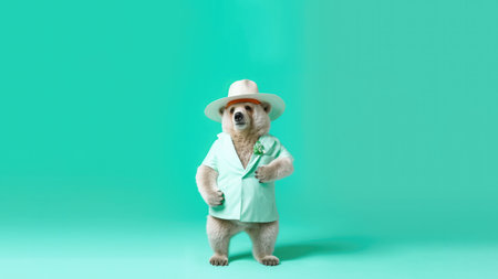 Bear dressed in a floral suit, wearing sunglasses, giving a thumbs up against a green backdrop