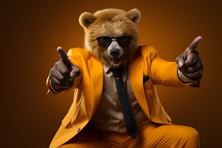 Funny bear in suit and sunglasses showing thumbs up on orange background