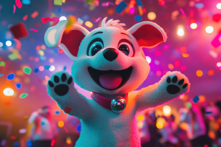A cheerful bear wearing glowing headphones dances energetically in a colorful party setting. Vibrant lights illuminate the scene enhancing the festive mood and playful ambiance.