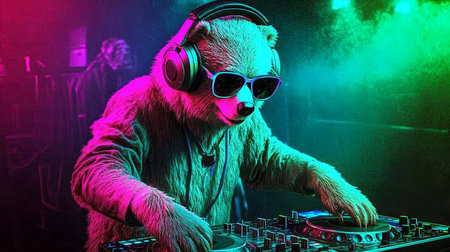 Neon Party Animal Cool Bear DJ in Headphones and Sunglasses Spinning Tracks at a Nightclub