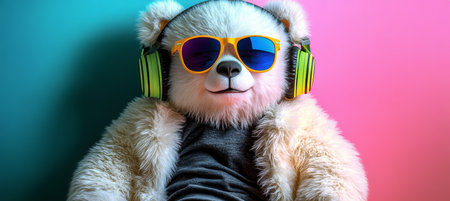 Trendy Stuffed Animal with Colorful Headphones and Sunglasses, Enjoying Music on Vibrant Background
