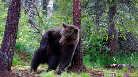 Brown bear (Ursus arctos) in the summer forest.