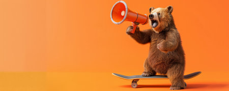 A cool bear with a skateboard, holding a megaphone on an orange background. The bear's relaxed pose and the megaphone's call add a fun touch.