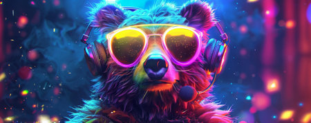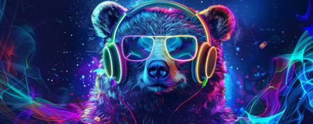 A funky bear with neon headphones, enjoying electronic music. Illustrated with vibrant colors and a dynamic, futuristic background.