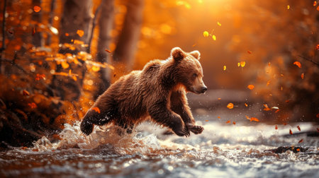 Young brown bear cub leaping over a stream in an autumn forest. Concept of wildlife, nature, animal behavior, forest habitat.