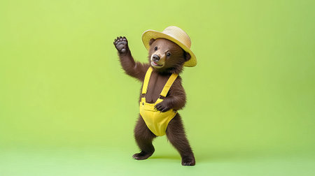 Playful Bear Cub Wearing Summer Hat and Yellow Outfit on Green Background. Concept of Cute Animal Fashion, Fun Wildlife, Cheerful Nature, Lighthearted Scenes.