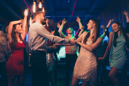 Lets dance my love. Portrait of positive cheerful couple students have wedding party dance on discotheque with lots people crowd wearing formalwear dress skirt in spotlight
