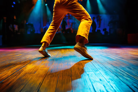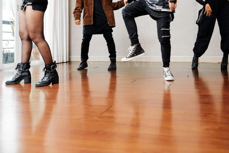 Group of hip-hop dancers performance on a stage, modern contemporary street dance with break dancing in studio, hip hop dance training in a ballroom, sneakers close up