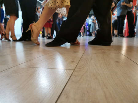 Detail of tango dancers in milonga ballroom