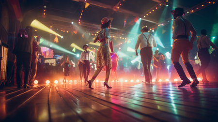 Close up shot of guests feet dancing and spinning around house during entertaining apartment party. People legs moving on energetic music rhythm, doing dance moves at social gathering