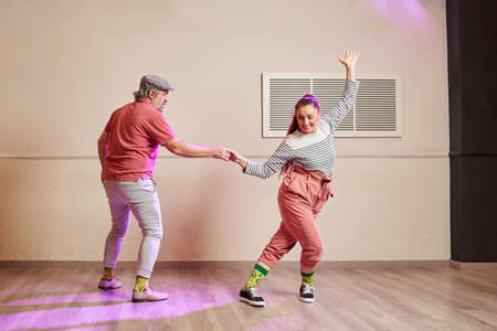 A couple of senior lindy hop dancers wearing funny socks