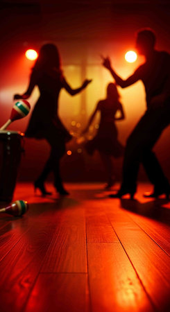 Couples dancing traditional latin argentinian dance milonga in a ballroom, tango salsa bachata kizomba lesson in red and purple lights, performance rehearsal, evening dance school class festival