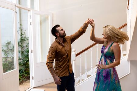 Side view of a Caucasian couple having fun dancing and smiling in the hallway of their house, beside the open front door