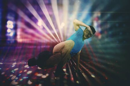 Young man doing break dance with light background at night