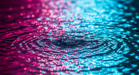 Close-up of water surface with a droplet creating concentric ripples illuminated by vibrant neon pink and blue light.