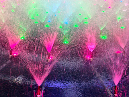vibrant led water display scene, colorful neon jets under led lights creating dynamic visual effects