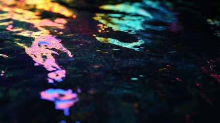 Rainbow spectrum reflection on rippling water surface. Concept of colorful liquid designs, light reflection patterns, abstract textures. Abstract background.