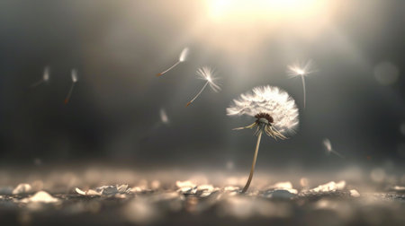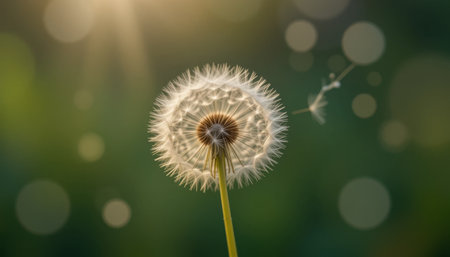 A dandelion blowing in the wind with sunbeams coming through, AI