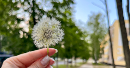 a woman's hand holds a dandelion with seeds on the background of a city street