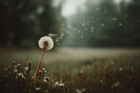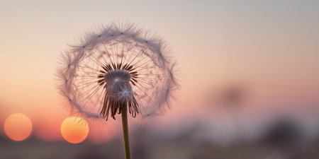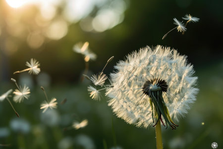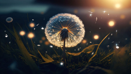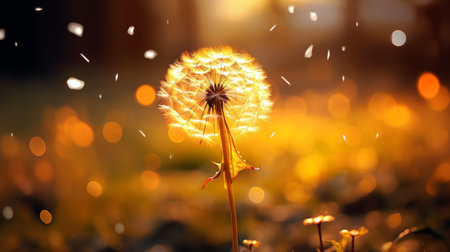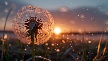 Dandelion seeds blowing in the wind at sunset, creating a magical and serene atmosphere. Ai generated image