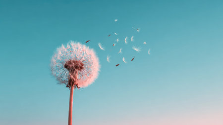 A close-up captures a dandelion seed head with floating seeds set against a gradient blue sky. The soft texture and white seeds contrast the smooth background. The composition suggests a daytime outdoor setting, suitable for illustrating themes of nature, growth, and change. This imagery could be utilized in various commercial and editorial projects.