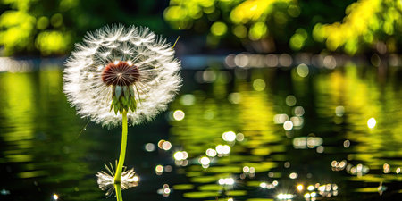 Dandelion seed head against a sparkling pond.