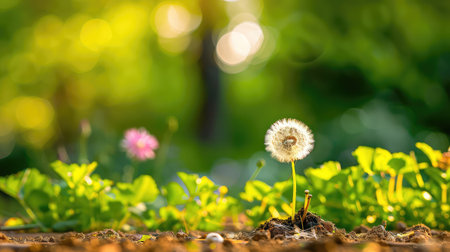 A beautiful dandelion flower stands tall in rich soil, illuminated by soft sunlight and surrounded by lush greenery, embodying the essence of spring.