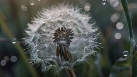 Dandelion with raindrop reflecting sunlight, showcasing nature s interplay between rain and sunshine