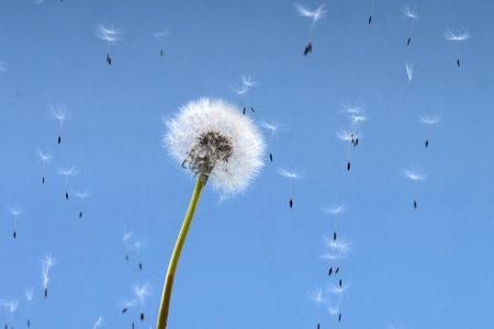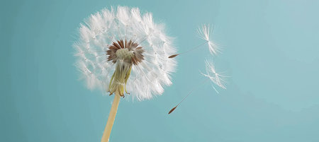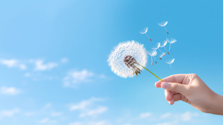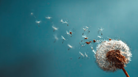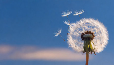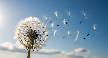 Dandelion with seeds blowing away in the wind across a clear blue sky, generative ai