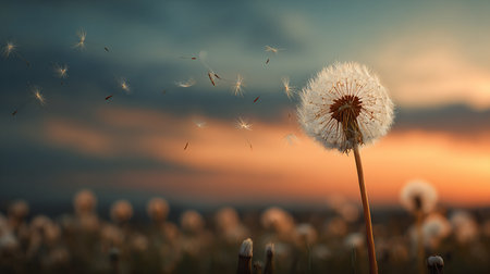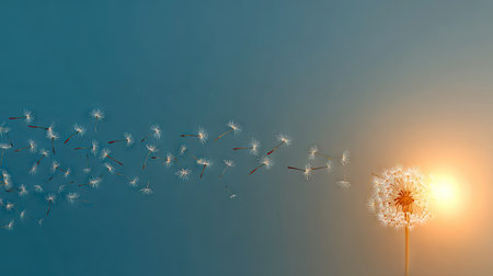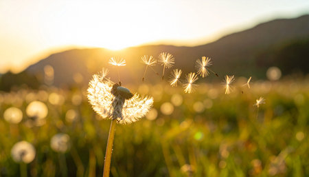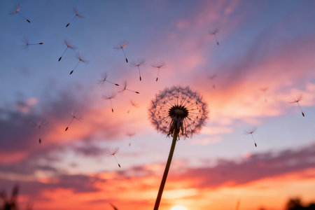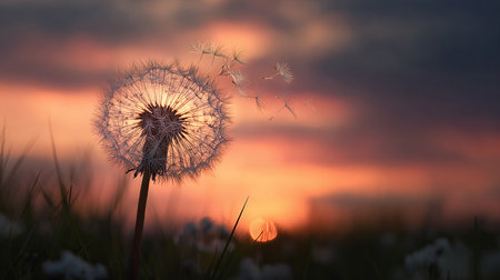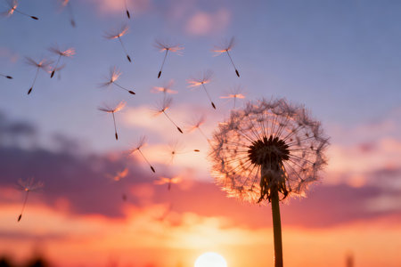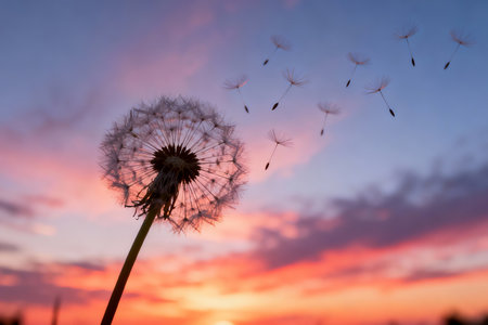 Ethereal Dandelion Seed Head Silhouettes Dispersing in a Warm Sunset Breeze of Hope and Renewal