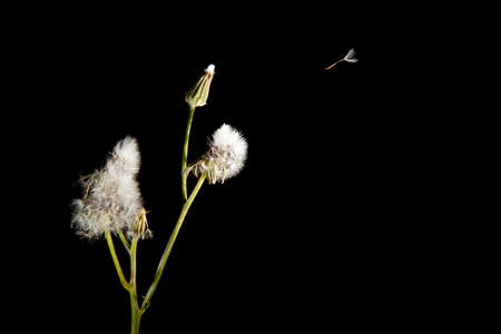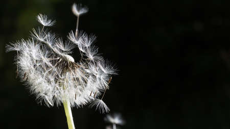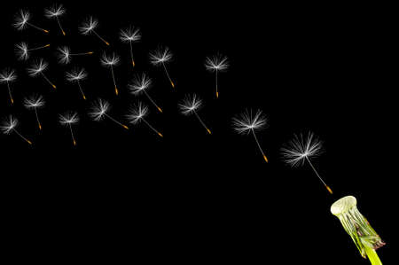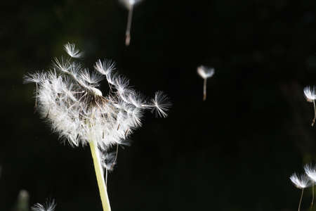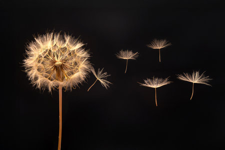 Dandelion seeds in the morning sunlight blowing away on a black background.