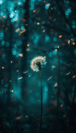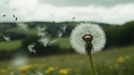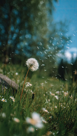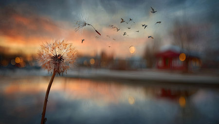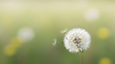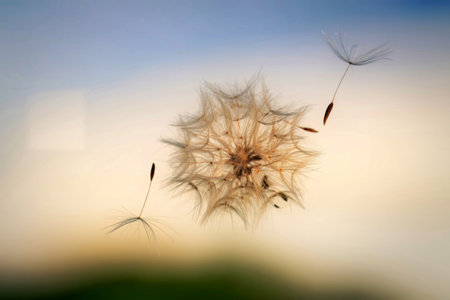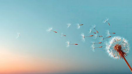Dandelion seed flying in the wind, symbolizing freedom and new beginnings on a serene nature scene.