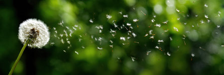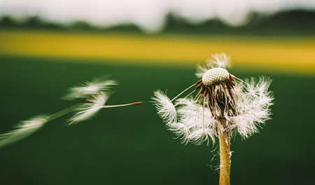 A close-up captures a dandelion releasing its seeds. The image features soft focus and a shallow depth of field, with seeds scattered against a blurred background. The color palette includes green, yellow, and white, suggesting an outdoor environment. This image could be suitable for various commercial or editorial uses.