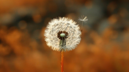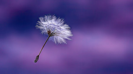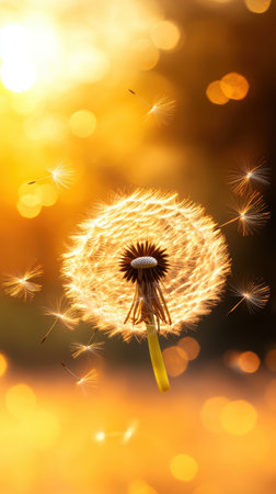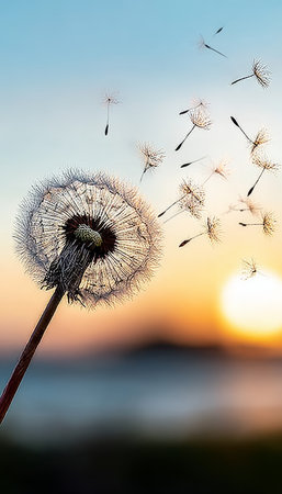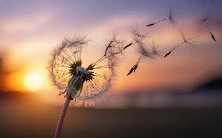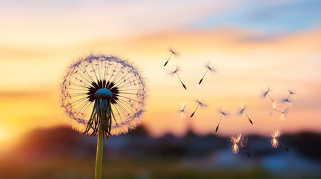 The showcases a close-up of a dandelion stem with seeds being dispersed into the air against a backdrop of a sunset. The dandelion seeds are delicate and fine, floating gently in the air, creating a serene and peaceful atmosphere. The sky is painted with warm hues of orange, pink, and purple, adding a soft and dreamy to the scene. The dandelion stem in the foreground is sharply focused, highlighting its intricate details and texture, while the seeds and background are softly blurred,...