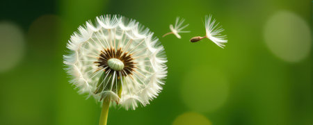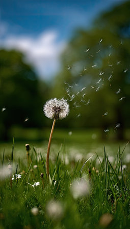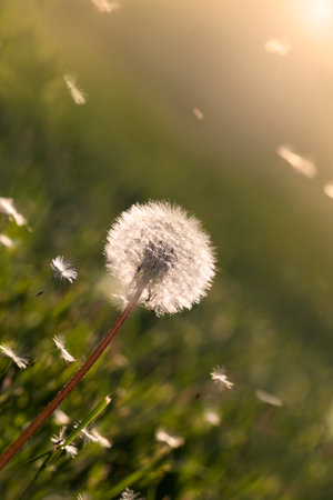 A close-up captures a dandelion shedding seeds amidst vibrant green grass, its feathery seeds scattered by an unseen force. The image features a shallow depth of field, with soft focus on the background. This scene evokes a sense of freedom and natural beauty, potentially suitable for various commercial projects.