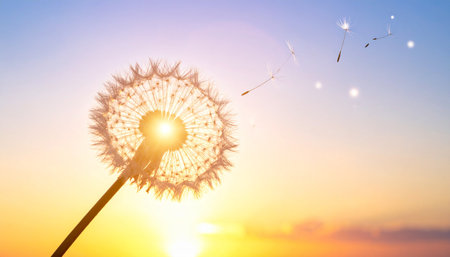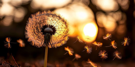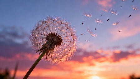 A close-up view shows a dandelion seed head with seeds dispersing into the air, set against a vibrant sunset. The warm light and colors create a serene atmosphere, with soft textures of the plant contrasting against the blurred background. This image could be used for various commercial or editorial projects.