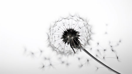 A close-up monochrome image of a dandelion seed head with seeds blowing away against a white background.