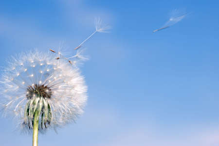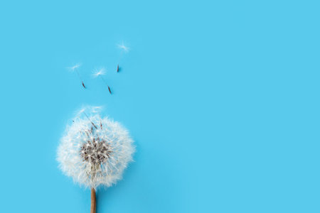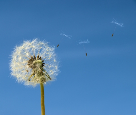 Dandelion with seeds blowing away in the wind across a clear blue sky with copy space