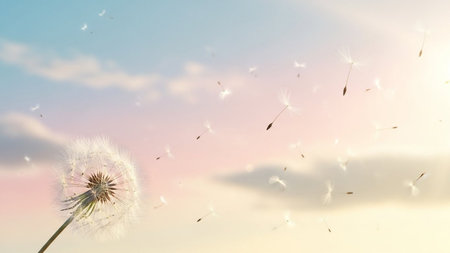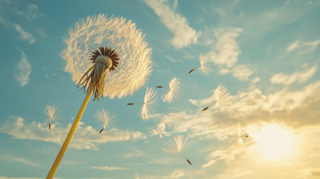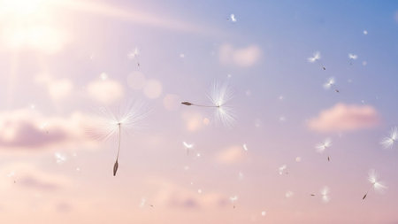 Dandelion seeds drift through a soft pastel sky with fluffy clouds, illuminated by warm sunlight, creating a dreamy...