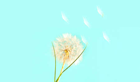 Close-up view of a dandelion seed head with its seeds dispersing in the wind against a vivid teal blue sky. The seeds are in motion, creating a sense of lightness and freedom. The background color is a soft teal, which complements the white and light brown colors of the dandelion.
