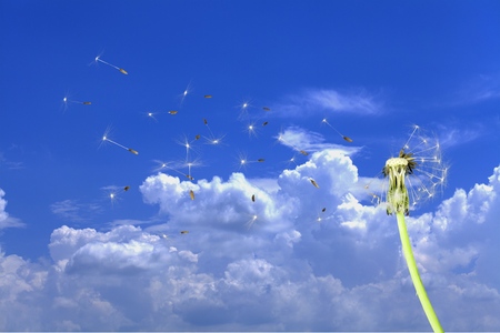 A single dandelion with its seeds floating in the wind stands against a blue sky dotted with white clouds. A single seed has already taken flight and is soaring towards the horizon. The scene is bright and full of sunshine.