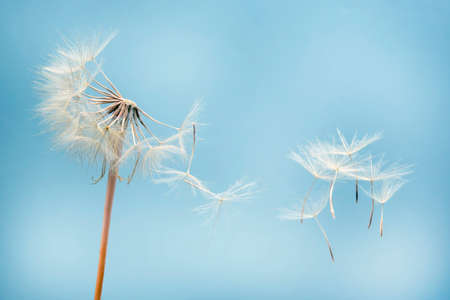 Dandelion seeds flying next to a flower on a blue background. botany and the nature of flowers