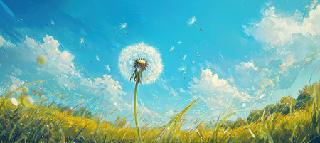 The wind scatters dandelion seeds against a radiant sky, a mesmerizing ballet of nature infinite cycle of endings and beginnings.