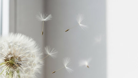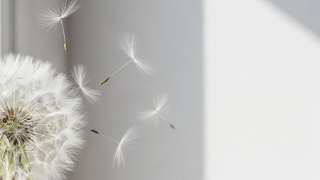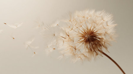 A dandelion puff with seeds gently drifting away on a light cream background. The airy and peaceful scene is ideal for natural cosmetics, organic branding, or children's themes.