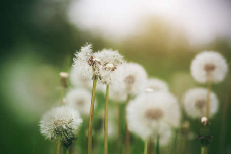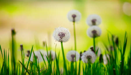 White fluffy dandelions, natural green blurred spring background, selected focus.