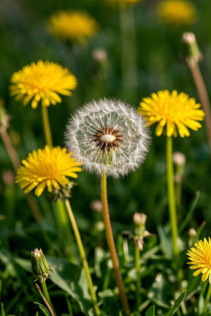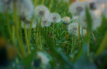 Shallow depth of field (selective focus) details with seeding and flowering dandelion flowers (Taraxacum) during a sunny spring day.