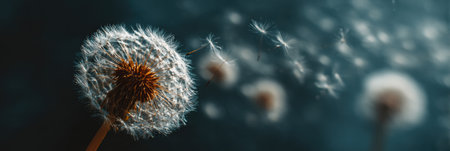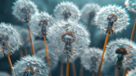 This stunning image captures close-up dandelions with fluffy seeds drifting in the gentle breeze, symbolizing nature's beauty and simplicity outdoors.